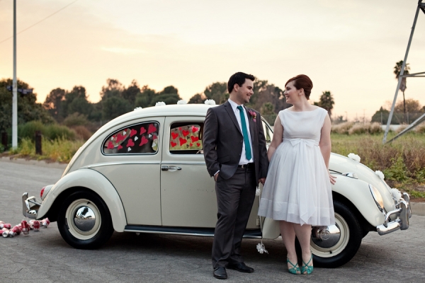 This first wedding, featured on Ruffled Blog, caught my eye with it's vintage accents, bright colors and sweet "love bug." Then the couple stole my heart with their romantic story and traveling gnome! Photography by Frenzel Photographers.